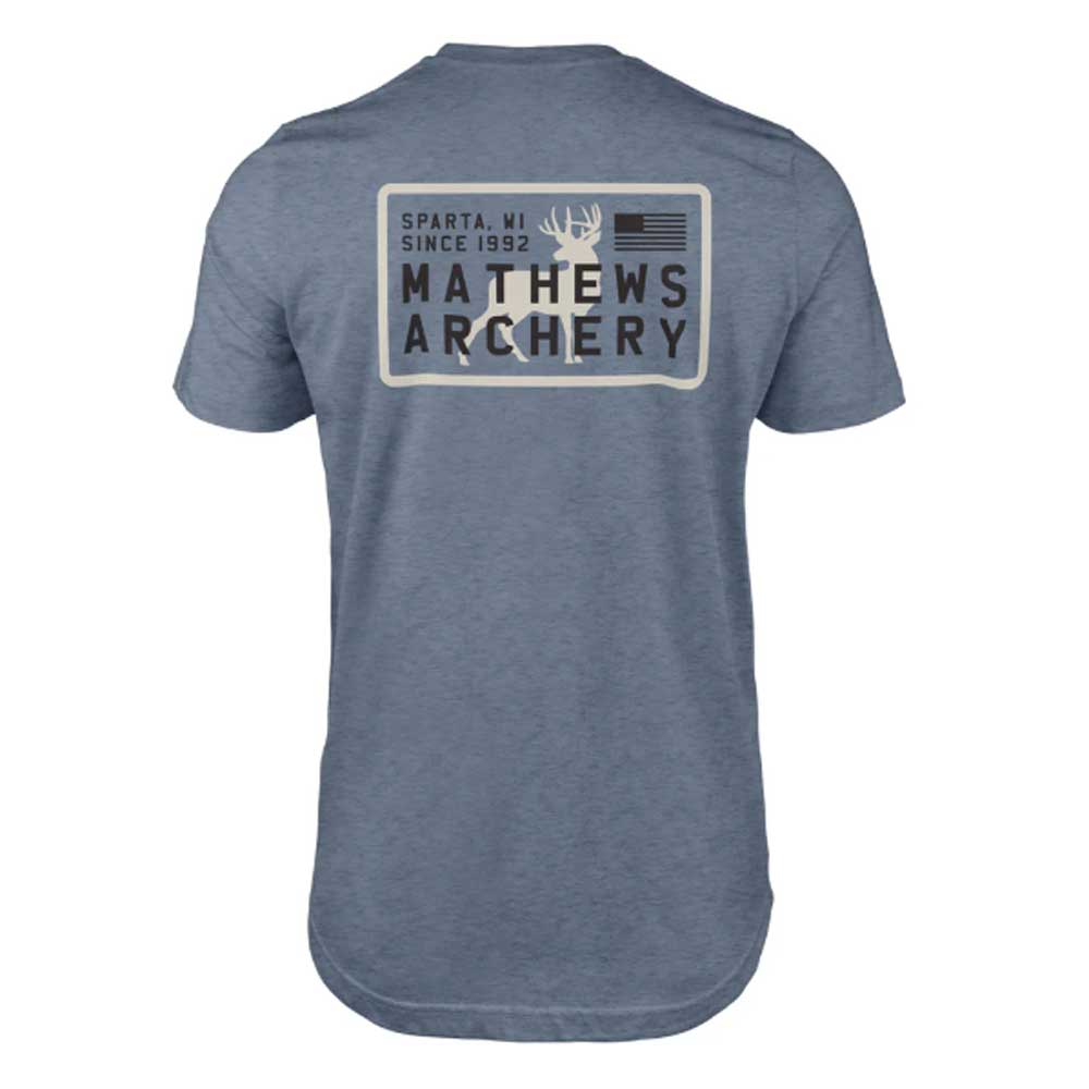 60% cotton, 40% polyester blend. Classic cut. Distressed Blue with a Mathews Archery portrait screen print on the back.