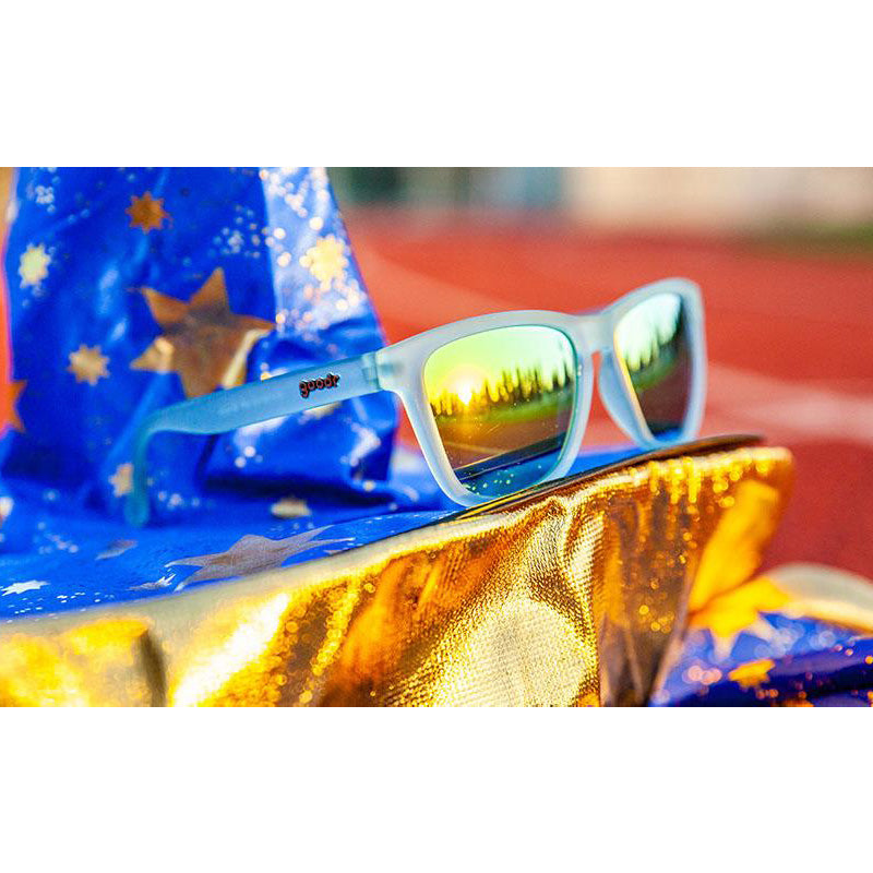 While it might be the magic that gets them all the love, we prefer to celebrate wizards for their panache: capes, pointy hats, and, beards. But just wait until you see one on their beach run rocking these fresh blue shades with gold lenses. Abracadabra, Muggles.