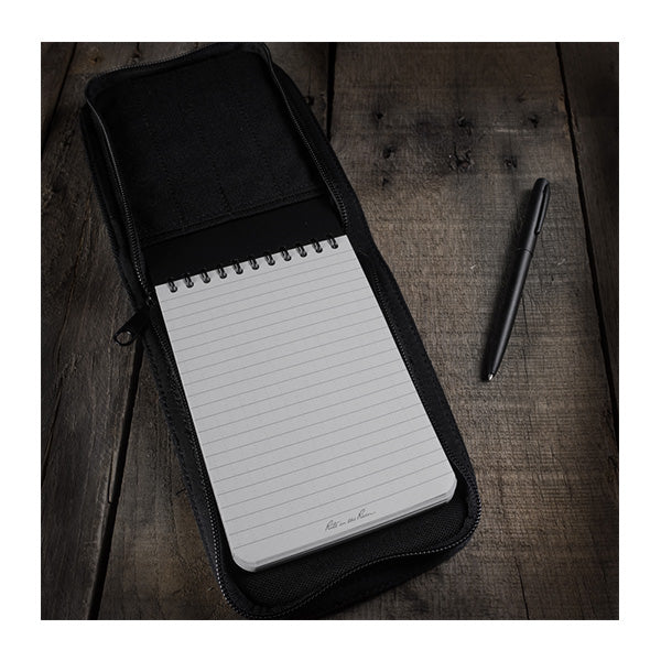 The 746B-KIT includes the following items:•No. 746 Pocket Notebook (4"x 6") - BlackPart of the New Midnight Collection, this 4" x 6" top-spiral notebook is discretely sophisticated with its black Polydura Cover and subdued light gray tinted paper. Each book contains 100 pages (50 sheets) of a dark gray Universal page pattern. The Midnight Collection is easy on the eyes, delivering the reliability you have come to expect from Rite in the Rain. •No. 97 All-Weather Black Clicker Pen - Black InkWhile a pencil works great on our All-Weather products, sometimes you just need a pen. These All-Weather pens write on wet paper and upside down in temperatures from -30F to 250F. Flat black metal barrel.•No. C946B CORDURA® fabric Cover - BlackThese CORDURA® fabric Covers fit all 4" x 6" top spiral notebooks. They have a rugged zipper closure and hold up to 4 writing utensils!