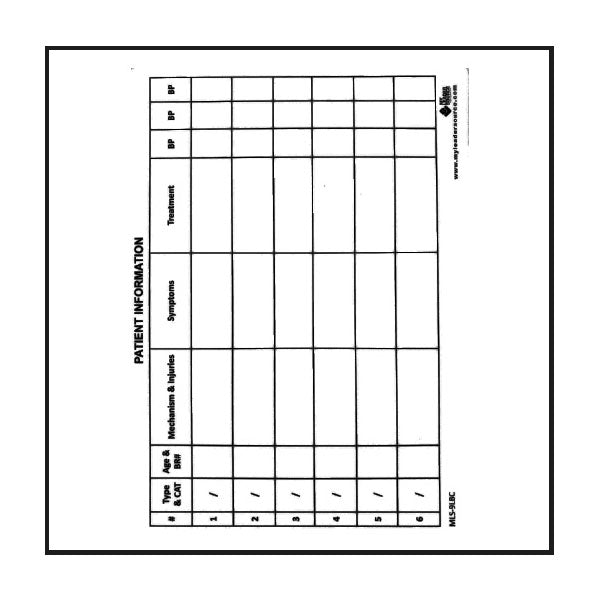The back allows the user to capture important information such as type & category, age, battle roster #, injuries, symptoms and treatment that allows for a quick easy way to transfer patient data.SHOP ALL MY LEADER SOURCE