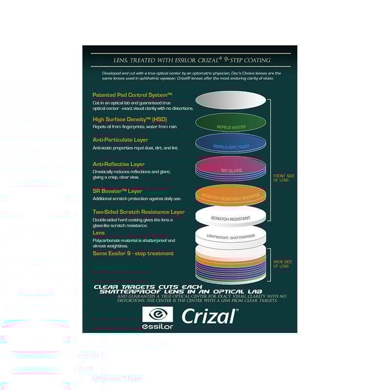 Doc's Choice Lens is developed by Essilor with the Crizal 9-Step finish. It allows you to see a sharp clear target with no distortions, no reflections, shatterproof, no glare, oil & water repellant, and fingerprint resistant lens.