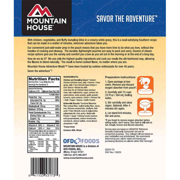 Mountain House Freeze Dried Chicken and Dumplings is a new twist on an old Southern favorite. With layers of chicken, vegetables and fluffy dumplings in a white gravy, this recipe gives you that home-cooked flavor you've been craving. The Pouch size makes this freeze dried meal portable enough to take with you camping or road tripping, and the best part? It's easy to make - just add hot water and you'll have delicious chicken and dumplings ready to enjoy in minutes. You can even eat 'em straight from the pouch if you'd like!With Mountain House Chicken and Dumplings, you don't have to worry about tedious meal prep or cooking after a long day on the trail. But you also don't have to worry about eating five granola bars for dinner, either. With Mountain House Chicken and Dumplings, you'll have a filling, comforting and truly delicious meal to enjoy without all the effort. And with a 30 Year Taste Guarantee, you can be certain it will taste great even years from now. Shop now and see why Mountain House is the best destination for camping, backpacking and emergency food online.