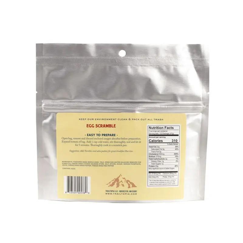 POWDERED EGGS (WHOLE EGGS, YOLK, DRIED EGG WHITES (GLUCOSE REMOVED FOR STABILITY)), FREEZE DRIED COOKED SAUSAGE (PORK, SALT, SPICES, SUGAR, SODIUM PHOSPHATE), ONION, FREEZE DRIED GREEN PEPPER, FREEZE DRIED RED PEPPER