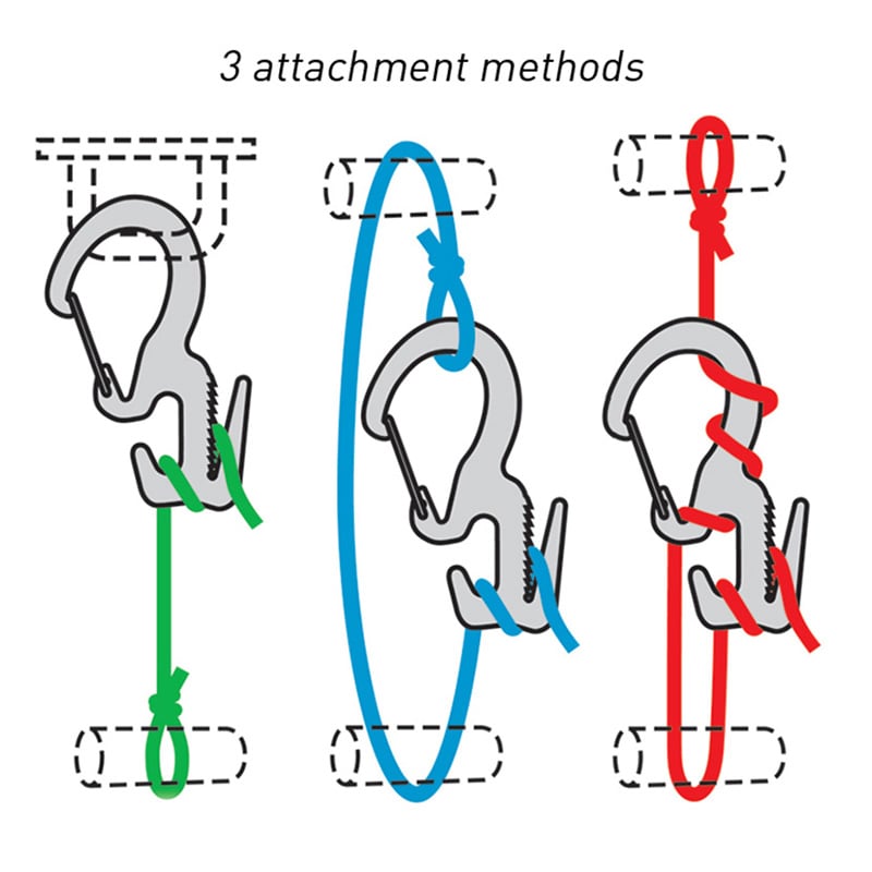 The Nite Ize Figure 9 Carabiner tightens, tensions, and secures ropes without knots. Whether tethering a canoe to your vehicle, anchoring boxes to a dolly, or bundling wood, this carabiner secures large loads quickly and keeps tension where you need it. Loop your rope through its strategically designed prongs, pull it tight, and it stays that way.A smart alternative to complicated cam-locking tensioning devices and bungee cords, the Figure 9 Carabiner also controls the release of high tension, avoiding sudden and dangerous unloading.