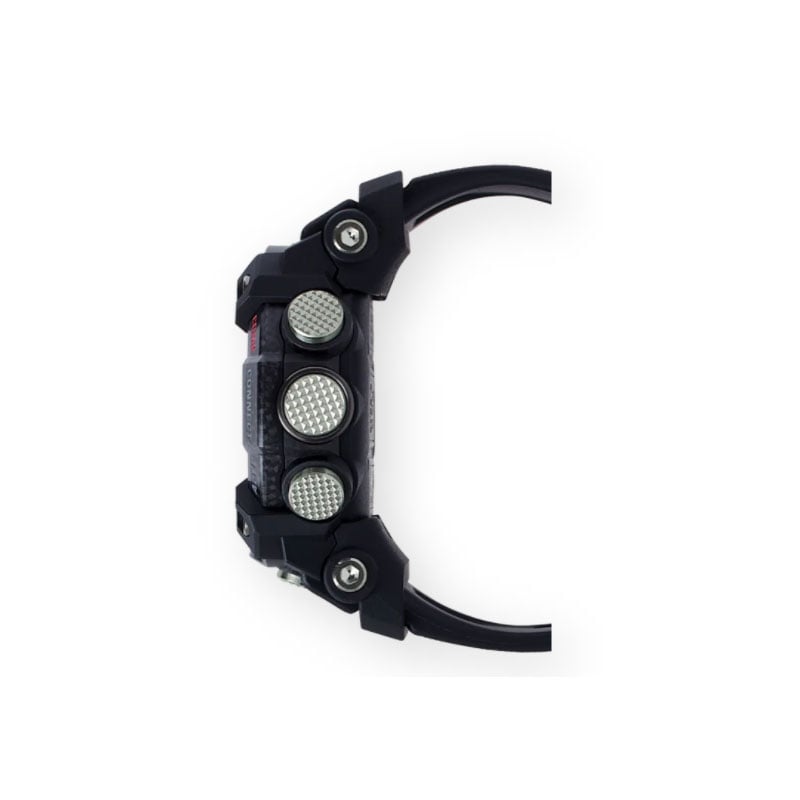 From the MASTER OF G Series MUDMASTER, the watch that is designed and engineered to withstand rough land environments, come carbon resin models that incorporate a new type of structure. The case is made of high-rigidity carbon material to protect against damage and deformation due to impact and other rough treatment, while metal button pipes ensure a tighter seal against the external environment. A filter further protects against the invasion of mud, for the high level of dust and mud resistance required when in severe environments. In addition, the dual back cover consists of a stainless steel panel back and an outer cover made of shock resistant fine resin embedded with glass fibers.