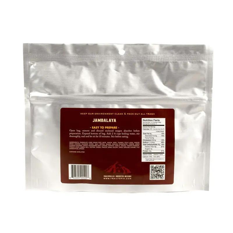 INGREDIENTS: PARBOILED LONG GRAIN RICE (RICE, NIACIN, IRON, THIAMIN, FOLIC ACID), FREEZE DRIED COOKED SAUSAGE (PORK, SALT, SPICES, SUGAR, SODIUM PHOSPHATE), FREEZE DRIED COOKED CHICKEN, CREOLE SEASONING (SALT, SPICES, PAPRIKA, GARLIC, ONION), TOMATO POWDER, FREEZE DRIED GREEN BELL PEPPER, ONION, FREEZE DRIED CELERY, DRIED GROUND SHRIMP, FILE (SASSAFRAS), SPICES