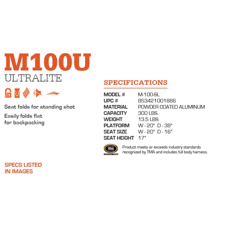 The M100 is one of the classic and most popular trees stand designs ever made; the M100U combines those design features with an aluminum-frame construction, giving it a weight of only 13.5 pounds — 20 percent lighter than the original M100. The M100U has the patented ComfortMAX seat with a back and side straps, providing the hunter a comfortable, stable seat that won’t collect water. While the seat folds up for bowhunters who want a stand-up shot, the M100U can be mounted with the M101 optional shooting rail for gun or crossbow hunters. And when it’s time to switch to a new stand site, the M100U folds flat and is easily carried with the included backpack straps. This is a stand that does it all, for bow or gun hunters, season after season.