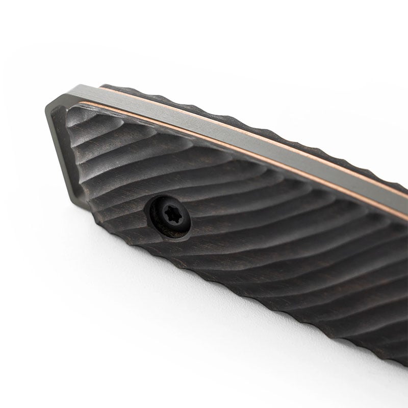 Every handle is lined with a polished copper accent, as well as our proprietary multiaxial Dynamic Fluting™ texturing pattern, which provides smooth ergonomics in the hand and improves grip. This handle design flows perfectly with the hand’s natural positioning and concentrates all the pressure onto the apex of the blade’s edge.