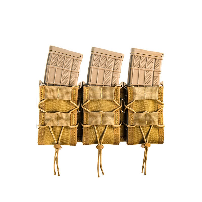 This MOLLE shingle will keep three rifle magazines secure and readily available. The three rifle TACO® pouches are permanently secured to a laser-cut laminate base ensuring easy and stable mounting on any PALS platform, such as vests, plate carriers and battle belts. Each rifle TACO® can hold almost any caliber rifle magazine, HSGI® Shot Shell Tray, flash bang and many other similarly sized items.